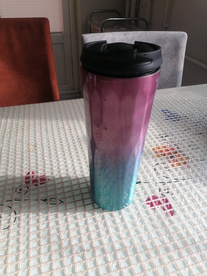 Mor ve mavinin renk geçişli tasarımına sahip seyahat termosu, siyah kapaklıdır ve pratik kullanım sağlar. ☕