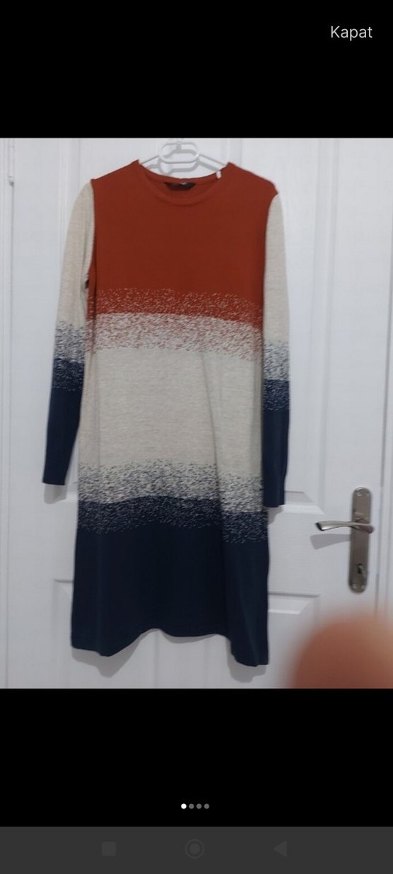 Uzun kollu, bol kesim, yün örgü kadın kazak. Gri tonlarında çok renkli tie-dye deseni ve yuvarlak yaka detayına sahip rahat bir model.