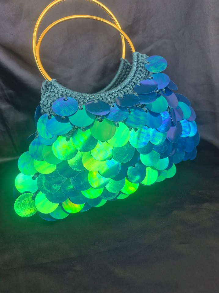Tamamı el işçiliği, hiç kullanılmadı,özel geceler için şık bir çanta Mavi yeşil yanar dönerli renkleri var... saplar dahil yükseklik: 30 cm genişlik : 30 cm dolabima göz gezdirirseniz sevinirim...