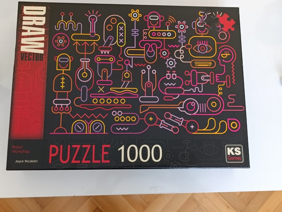 Canlı renklerde soyut çizgi sanatına sahip 1000 parçalık puzzle. Koyu zemin üzerinde parlak neon renklerle çeşitli şekiller ve desenler içerir.