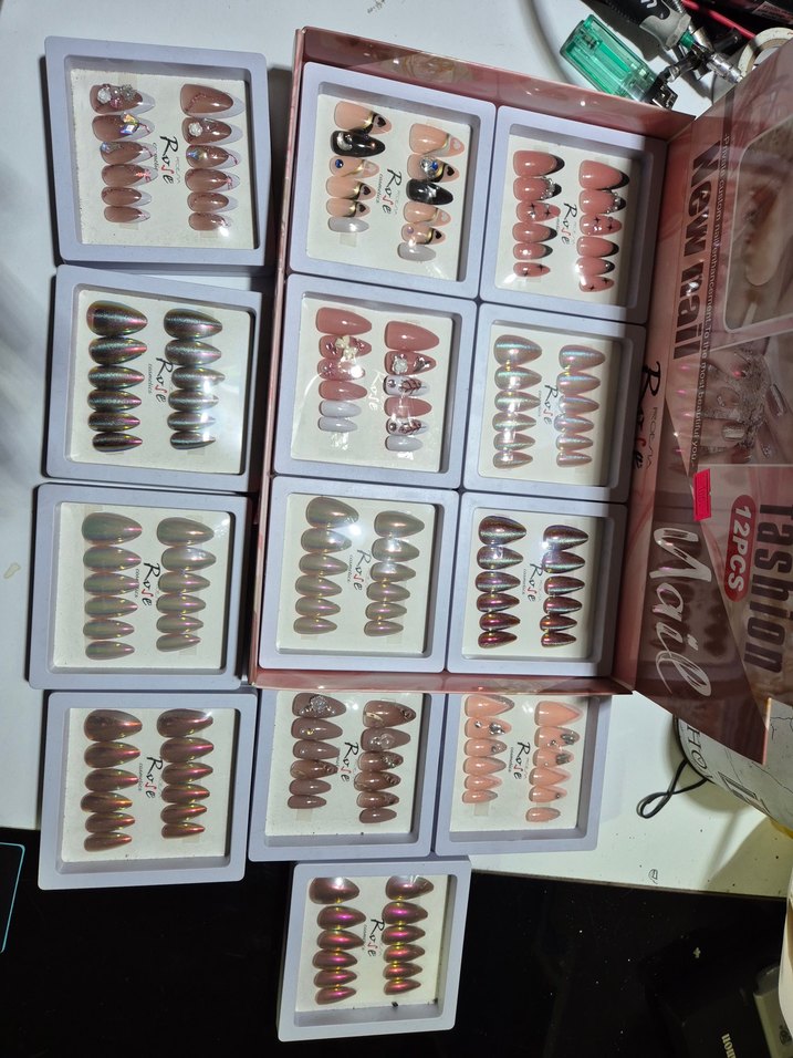 Canlı açık renk tonlarında, bej renkli 12'li tırnak süsleri seti. Her pakette 12 parça bulunur.