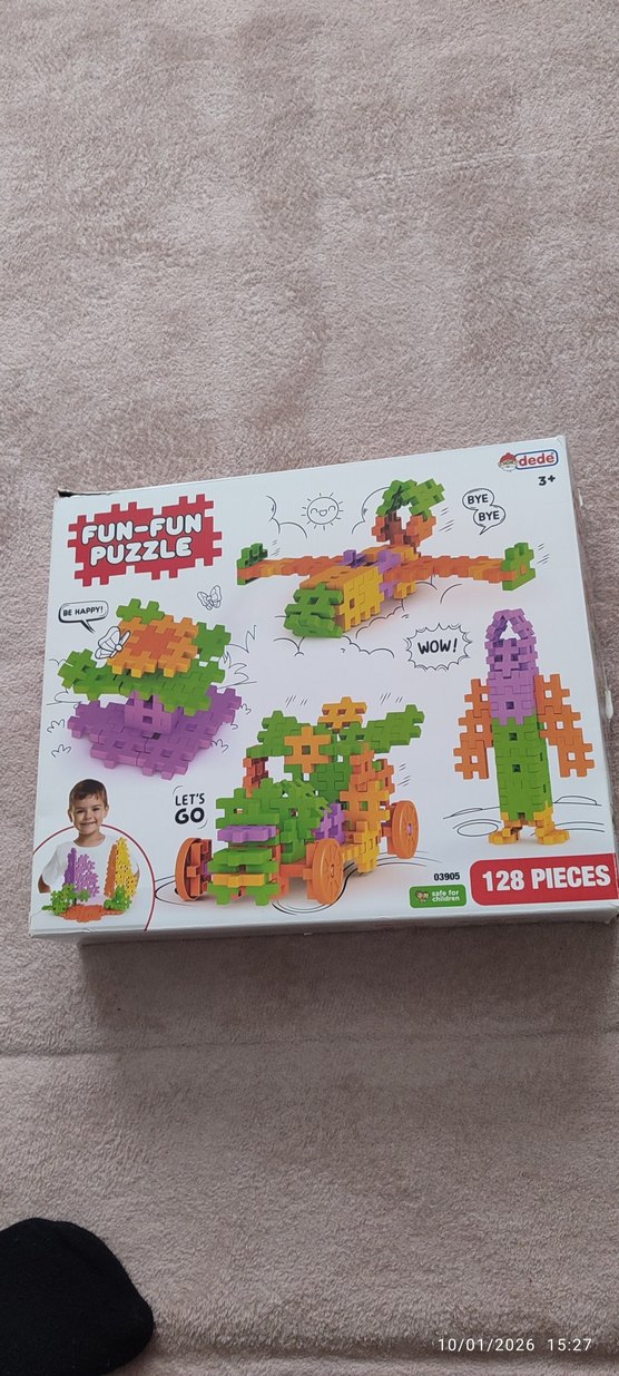 3 yaş ve üzeri çocuklar için 128 parçalı renkli puzzle seti. Uçak, roket, araba ve çiçek figürleriyle yaratıcılığı destekler. #oyuncak #lego