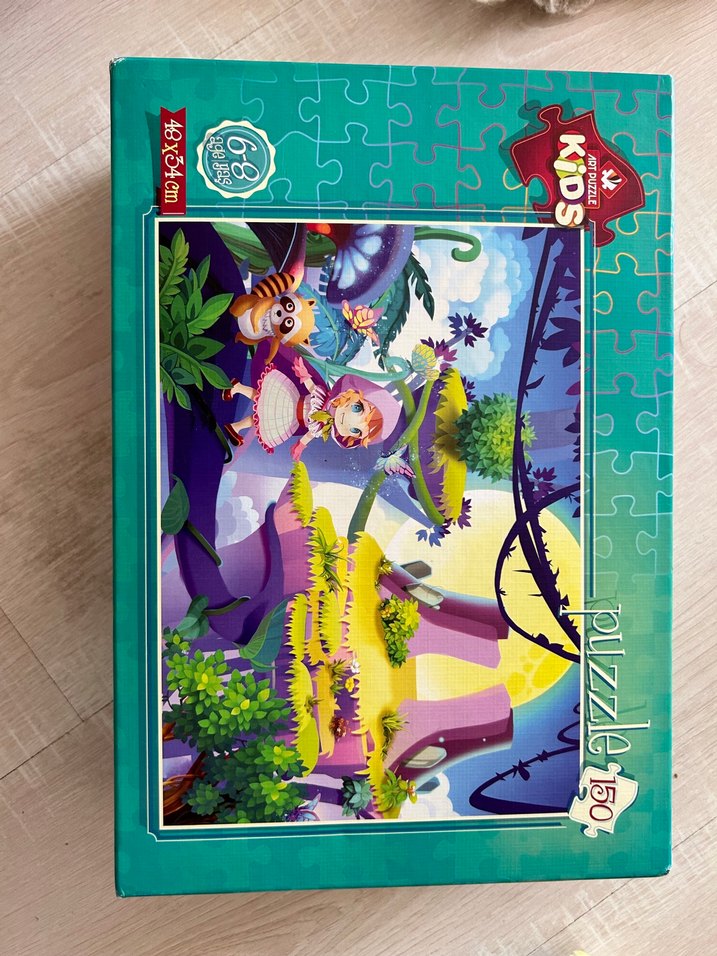 Renkli, 150 parçalı çocuk yapbozu. Canlı ve fantastik bir sahne ile karakterler ve doğa öğeleri içerir. "KD" işaretli.