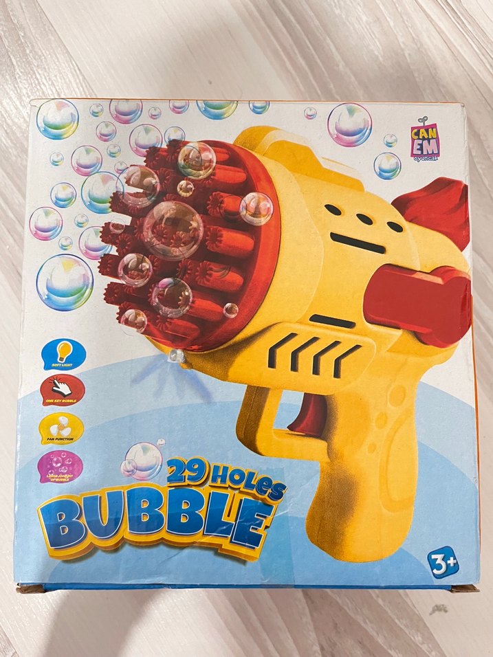 Renkli sarı köpük tabancası, 29 delikli yapısıyla çok sayıda köpük çıkarır. 1 kere denedim hevesimi aldım köpüğü full dolu