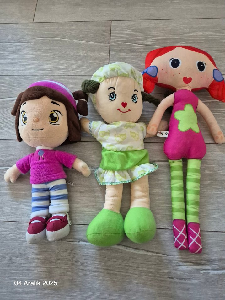 Farklı kıyafet ve ifadeye sahip, yumuşak kumaştan yapılmış üç renkli peluş bebek seti. sıfır ayarında temiz sorunsuz defosuz