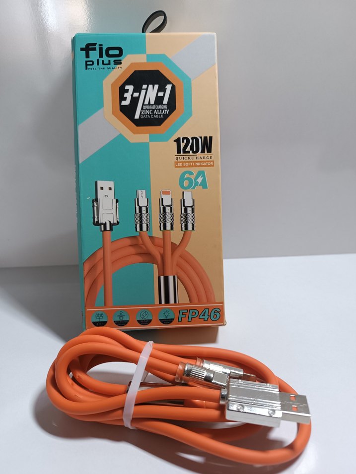 Renkli 3'ü 1 arada kablo, 120W hızlı şarj ve 6A akım destekler. Çoklu bağlantı seçenekleri sunar.