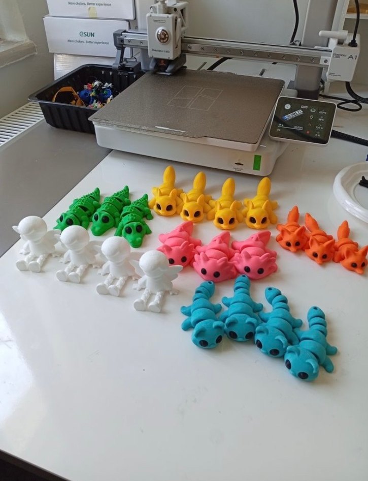Yeşil, sarı, turuncu, pembe, mavi ve beyaz gibi canlı renklerde çeşitli şekillerde renkli 3D baskı aksiyon figürleri.