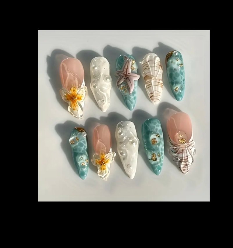 Pastel renklerde, deniz temalı 3D figürler içeren çok renkli tırnak süsleri. 10 adet 3 boyutlu tırnak seti