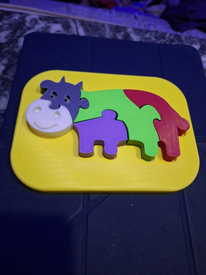 Bu renkli eğitim oyuncağı, sarı bir taban üzerinde birbirine geçen parçalarla 3d inek yapbozu sunar.PLA filament ile üretilmiş tamamen sağlıklı oyuncak.