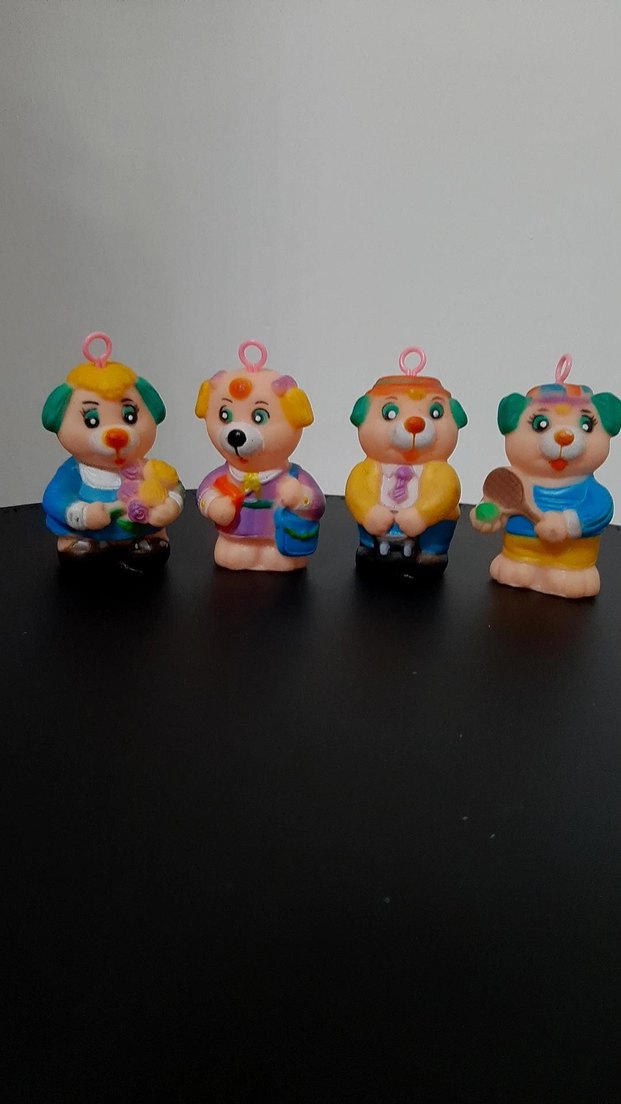 Renkli, farklı detaylara sahip 4 adet oyuncak köpek figürü seti. Üzerlerinde küçük halkalar mevcuttur