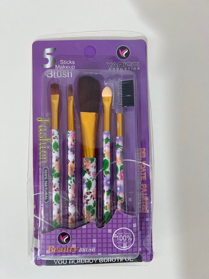 Mor ambalajda, floral saplı ve çeşitli fırça tiplerine sahip 5 renkli makyaj fırçası seti. Yarigci markalıdır.