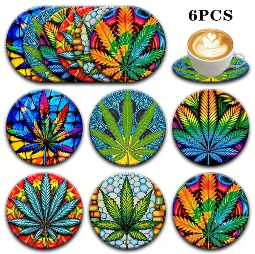 6 parçadan oluşan, yaprak desenli renkli bardak altlıkları seti, yüzey koruması ve canlı bir görünüm sağlar.