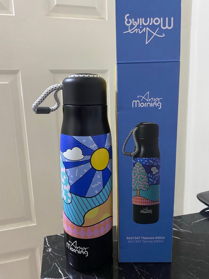 600ml kapasiteli, renkli doğa desenli termos, kullanışlı taşıma askısı ile sıcak ve soğuk içecekler için uygundur.
