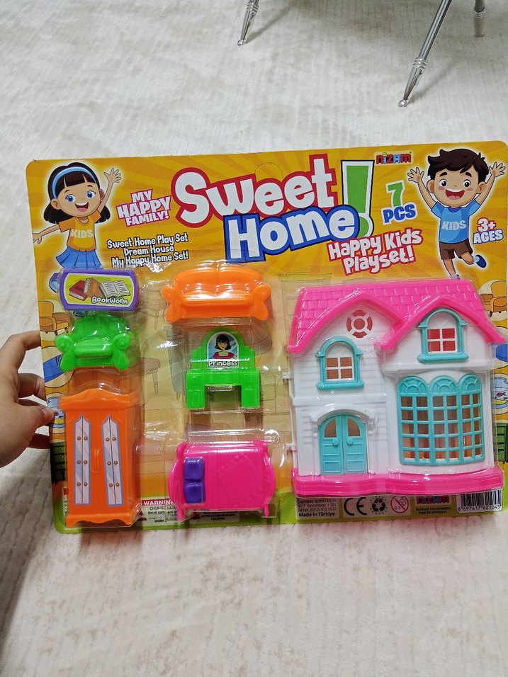 3 yaş ve üzeri çocuklar için küçük ev ve mobilya parçalarından oluşan renkli 7 parçalı Tatlı Ev oyun seti. Yatak, dolap ve diğer aksesuarlar dahil.