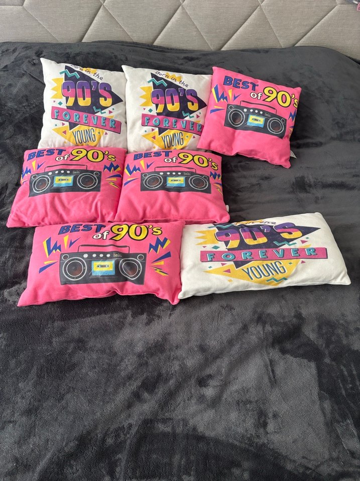 Canlı pembe ve beyaz tonlarda, 'YOUNG' ve 'FOREVER' yazılı 90'lar temalı renkli pop kültür yastık lar kullanıma bağlı az renk solması var