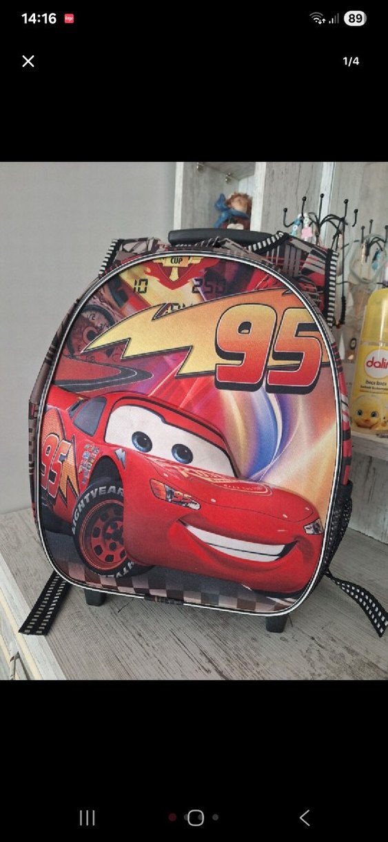 Renkli ve canlı kırmızı renkte, üzerinde neşeli bir araba ve 95 sayısı bulunan çocuk okul çantası. Ayarlanabilir askıları ve geniş ana bölmesi vardır.