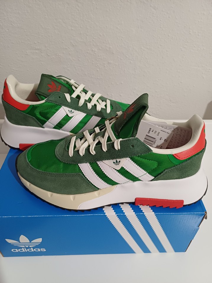 Renkli Adidas erkek spor ayakkabıları, beyaz şeritler ve velcro detaylarıyla baskılı yeşil tasarıma sahiptir. Kauçuk taban, spor ve günlük sokak stili için sağlam konfor sunar.