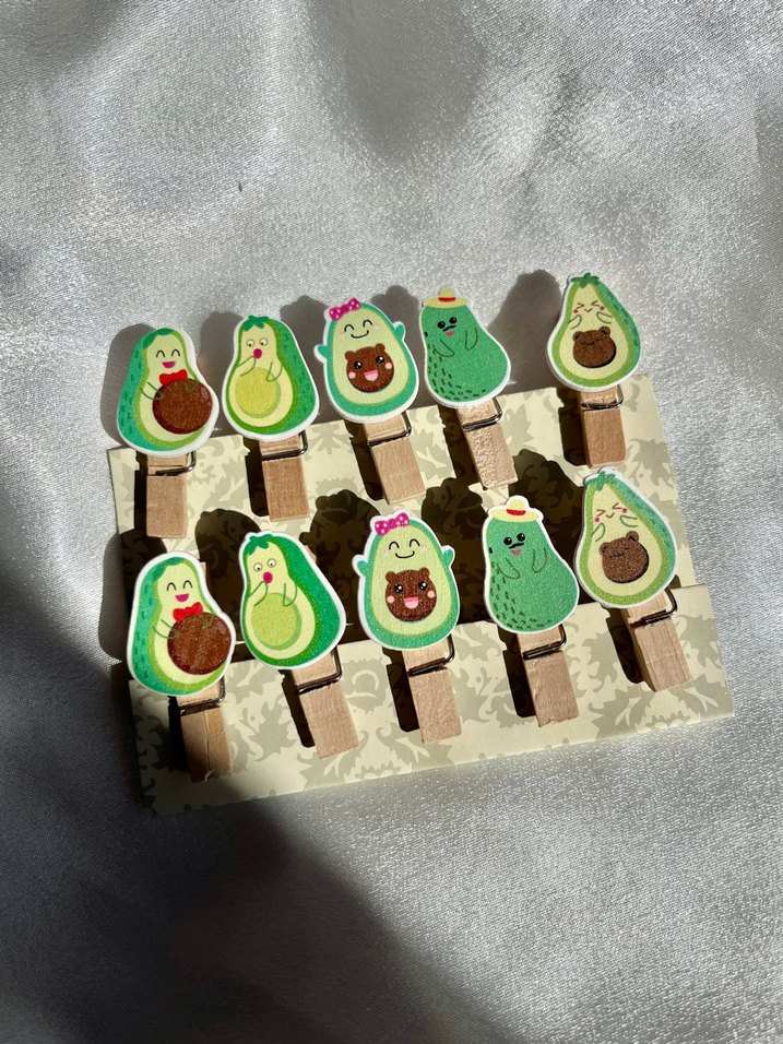 Sevimli gülen yüzlü avokado figürlü renkli ahşap mandallar. Dekorasyon veya küçük eşyaları düzenlemek için uygundur.