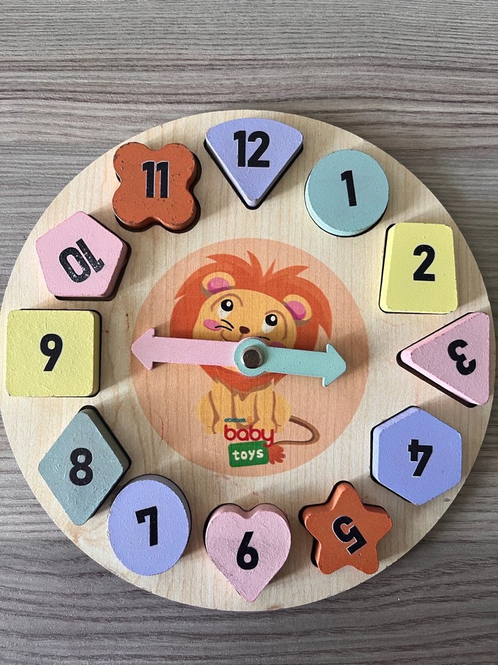 Renkli ahşap saat oyuncağı, sayılar ve hareketli göstergelerle bebeklerin sayı ve zamanı öğrenmesine yardımcı olur.