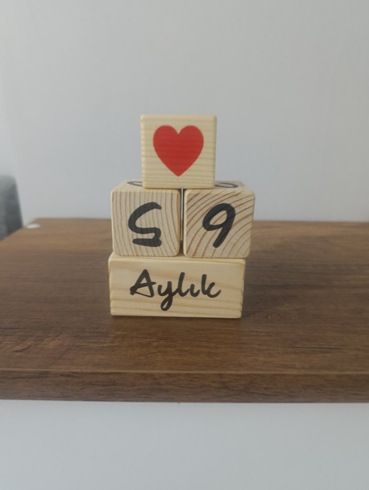 Rakamlar, harfler ve kalp simgesi içeren renkli ahşap bloklar, üst üste koyma ve öğrenme için uygundur.