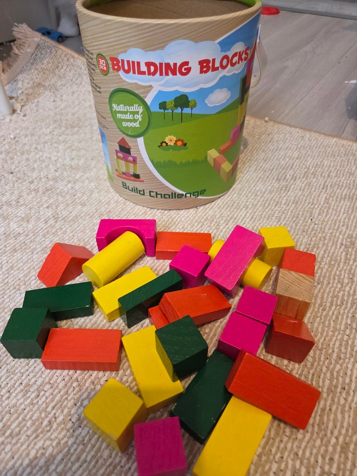 Farklı şekillerde renkli ahşap bloklar, yaratıcı oyun ve inşa için. Yuvarlak kutuda 'Building Blocks' yazılıdır. 27 parça ( 3 parça eksik)