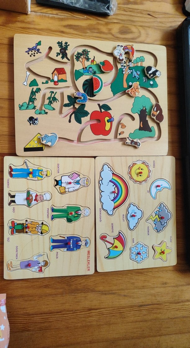 Hayvanlar, meyveler, hava durumu sembolleri ve geleneksel kıyafetli insanlar içeren renkli ahşap çocuk bulmacaları seti. Canlı, çok parçalı tasarımlar içerir.