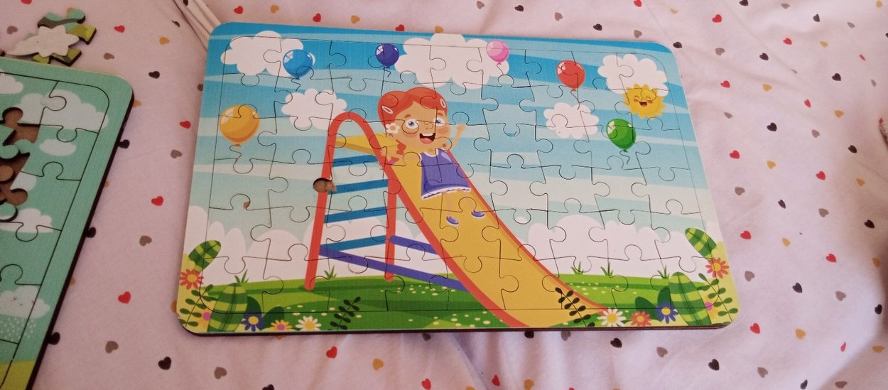 Renkli çocuk yapbozu, kaydıraktan kayan bir çocuğu, balonları ve bulutları içerir. Canlı ve eğlenceli tasarım çocuklar için uygundur. hepsini ahşap hepsi çok iyi ve çocuğum haftalarca meşgul oldu büyüdüğü için satıyorum. parçaları da farklı. sorabilirsiniz kimi 24 parça kimi 56 kimi 70 üzeri. fiyat her biri içindir. tek tek 70 ama kağıt 40 olur. pazarlık için mesaj atabilirsiniz.