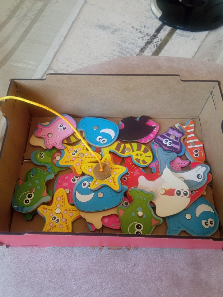 Çeşitli deniz canlılarından oluşan, ip ile dizilebilen renkli ahşap eğitici oyuncak. İnce motor becerilerini ve el-göz koordinasyonunu geliştirir.