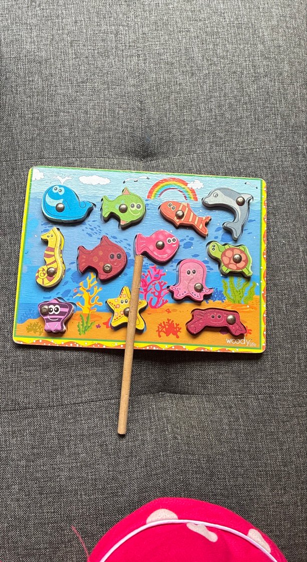 Renkli ahşap deniz canlıları ve mıknatıslı olta içeren eğitici oyuncak, ince motor becerilerini ve tanımayı geliştirir.