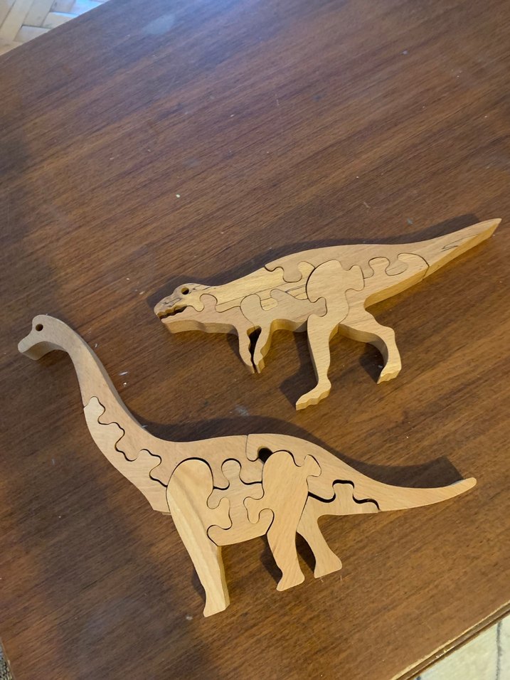 Renkli kahverengi tonlarında, birbirine geçen parçalardan oluşan iki ahşap dinozor figürü. İki adet fiyatıdır bir tanesinde çok küçük kırık var