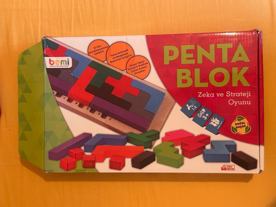 Çeşitli şekillerde renkli ahşap bloklardan oluşan eğitici oyuncak, problem çözme ve sayma becerilerini geliştirir. 3 yaş ve üzeri için uygundur. Çok az kullanılmıştır.
