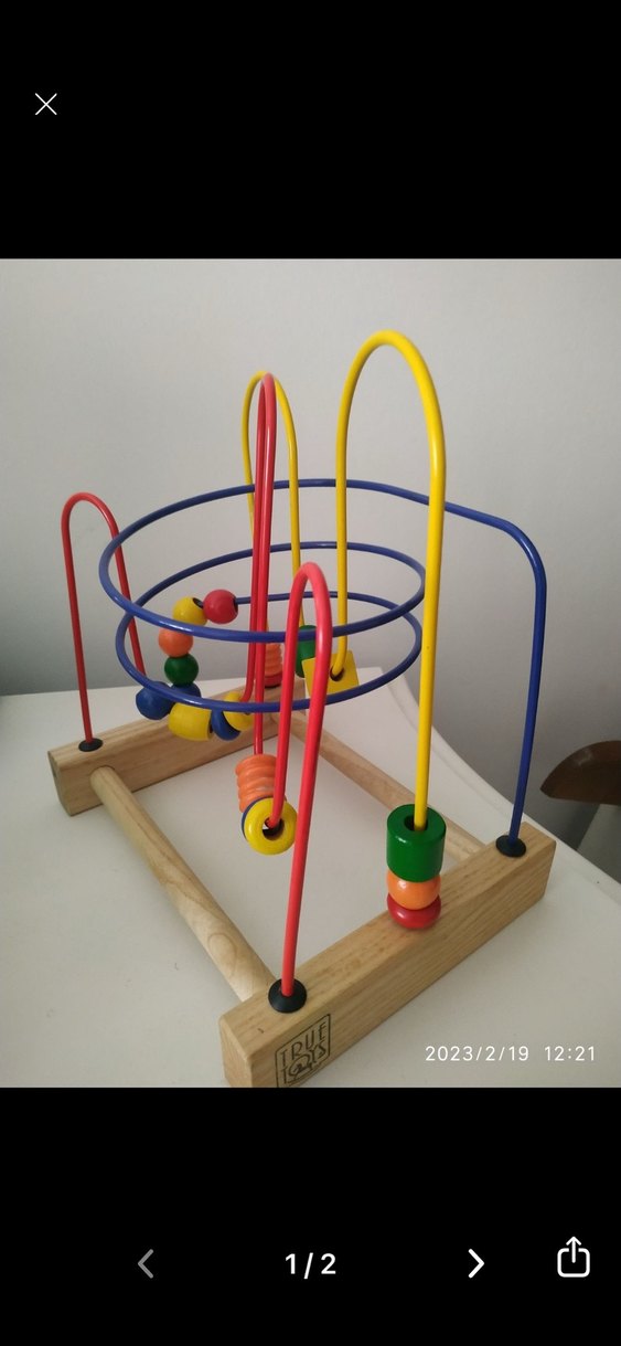 Ahşap taban ve renkli teller üzerinde boncuklar bulunan eğitici oyuncak, ince motor becerilerini ve el-göz koordinasyonunu geliştirir.