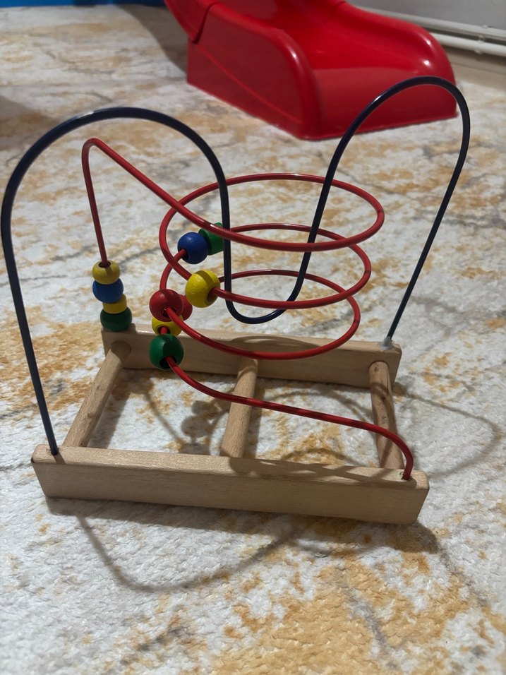 Renkli boncukların tel üzerinde hareket ettirildiği ahşap eğitici oyuncak, ince motor becerilerini geliştirir.
