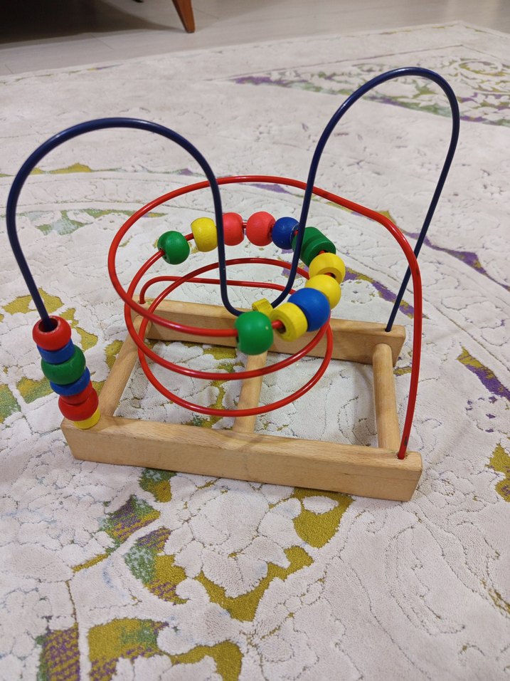 Renkli ahşap boncukların teller üzerinde hareket ettirildiği, ince motor becerilerini geliştiren eğitici oyuncak.
