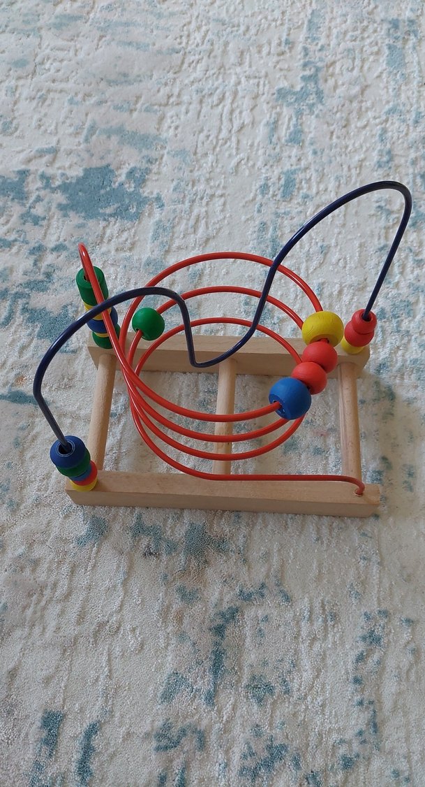 Ahşap boncuklar ve kıvrımlı metal tellerden oluşan renkli eğitici oyuncak, ince motor becerilerini ve el-göz koordinasyonunu geliştirir.