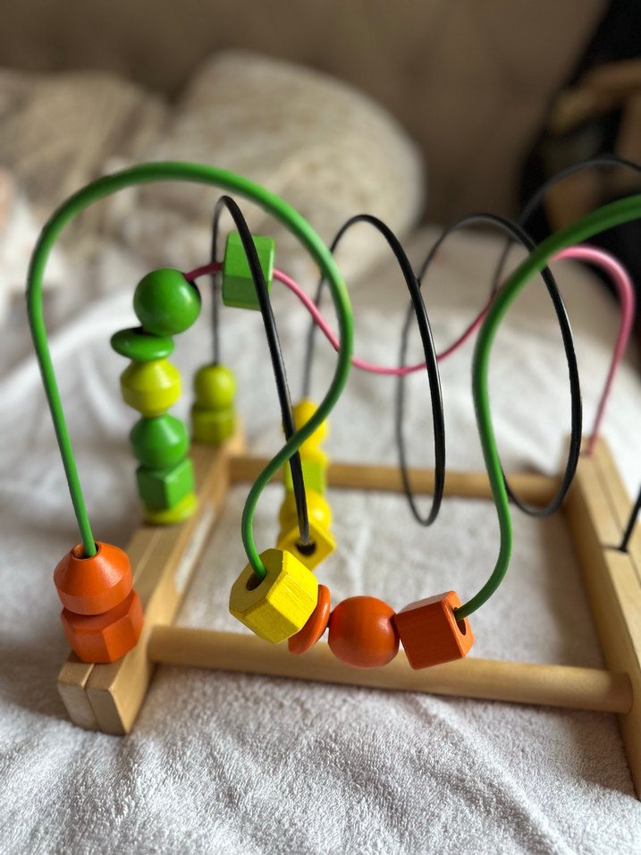 Renkli ahşap boncukların tel yollar üzerinde hareket ettirildiği, ince motor becerilerini ve el-göz koordinasyonunu geliştiren eğitici oyuncak. Çok az kullanıldı