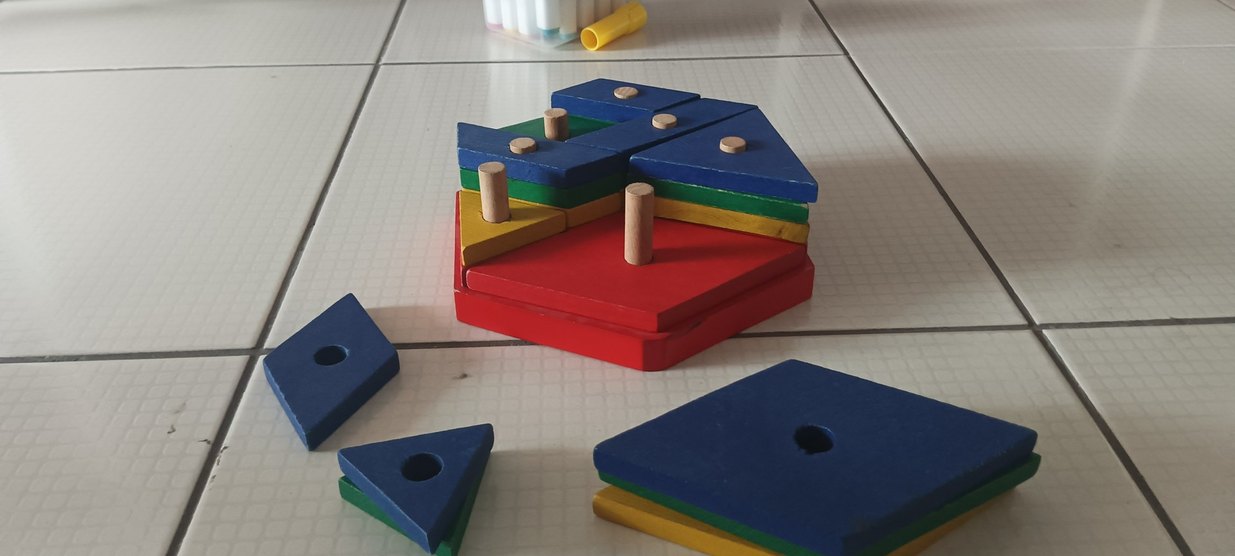 Çok renkli ahşap eğitici oyuncak, çeşitli geometrik şekillerden oluşur ve motor becerileri geliştirmeye yardımcı olur.