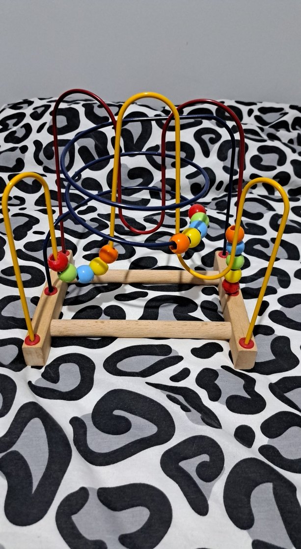 Eğitici renkli ahşap oyuncak, kıvrımlı teller üzerinde kayan boncuklarla ince motor becerilerini geliştirir.