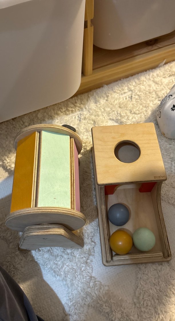 Ahşap eğitici oyuncak, renkli panellerle dönen bir silindir ve farklı renklerde üç top içeren kutudan oluşur. Motor becerileri ve renk tanımayı destekler.