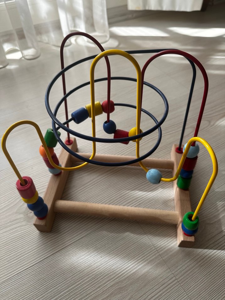 Renkli ahşap eğitici oyuncak, ince motor becerilerini geliştirmek için çeşitli kavisli teller üzerinde kayan boncuklar içerir.