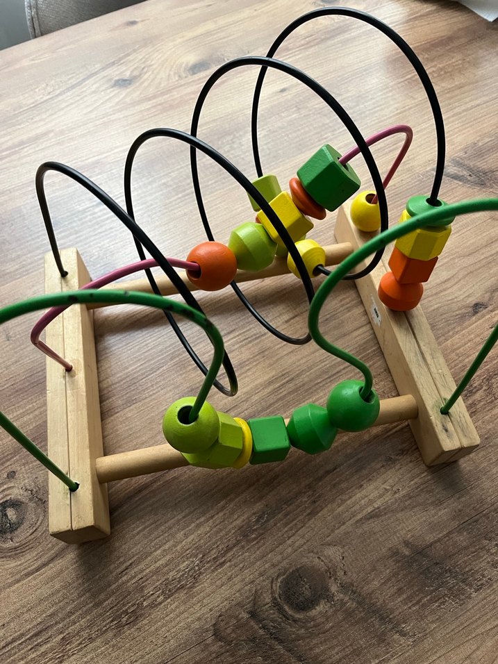 Çocukların ince motor becerilerini ve el-göz koordinasyonunu geliştiren boncuk labirentli renkli ahşap eğitici oyuncak.