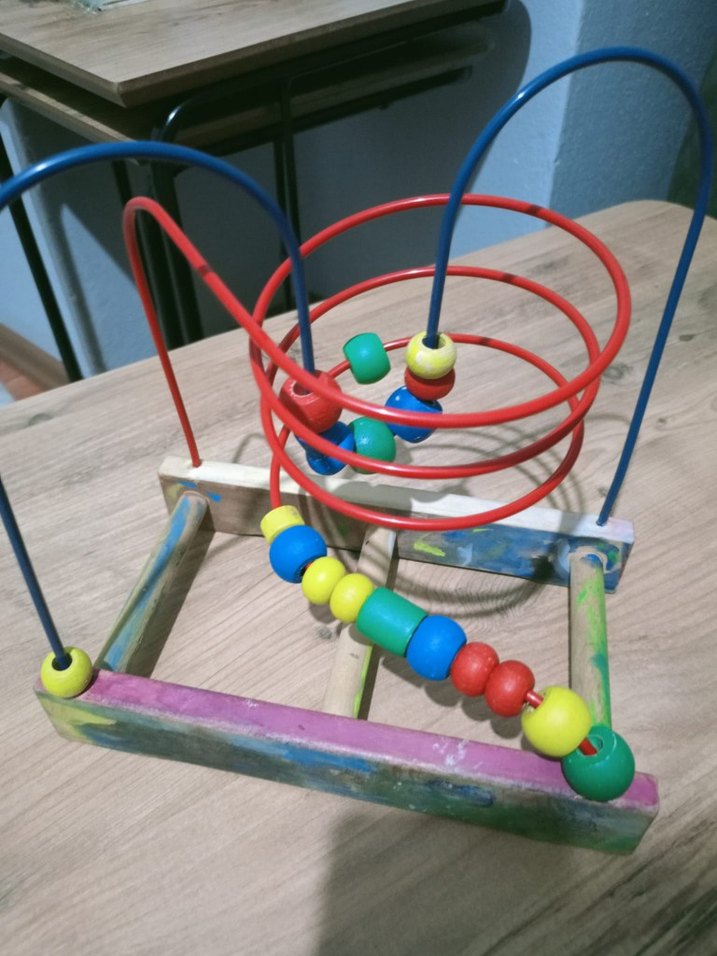 Bu renkli eğitici oyuncak, ince motor becerilerini ve el-göz koordinasyonunu geliştirmek için tahta boncuklar ve tel yollar içerir.