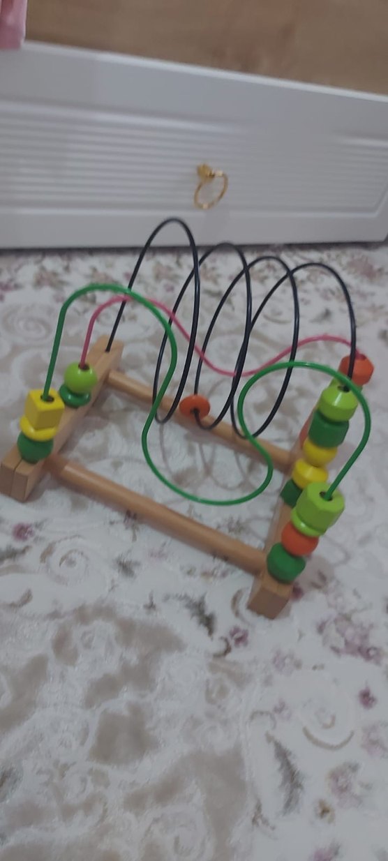 Bu renkli ahşap eğitici oyuncak, çocukların ince motor becerilerini ve el-göz koordinasyonunu geliştirmesi için boncukların hareket ettirilebildiği kıvrımlı teller içerir.