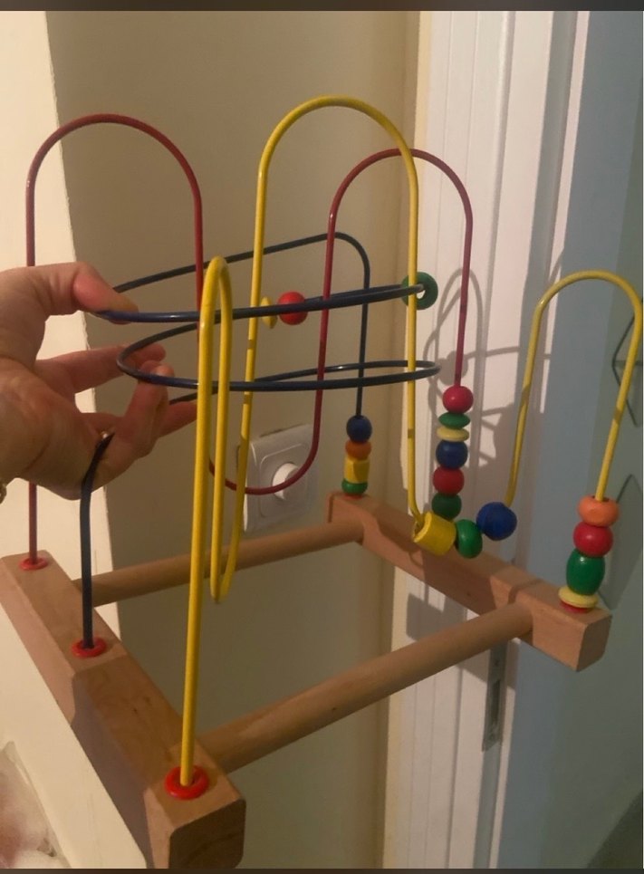 Motor becerileri ve el-göz koordinasyonunu geliştiren teller üzerinde boncuklu renkli ahşap eğitici oyuncak.