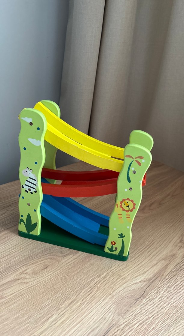 Bu renkli ahşap eğitici oyuncak, top veya arabaların yuvarlanması için çoklu rampalara sahiptir ve eğlenceli hayvan figürleriyle süslenmiştir.