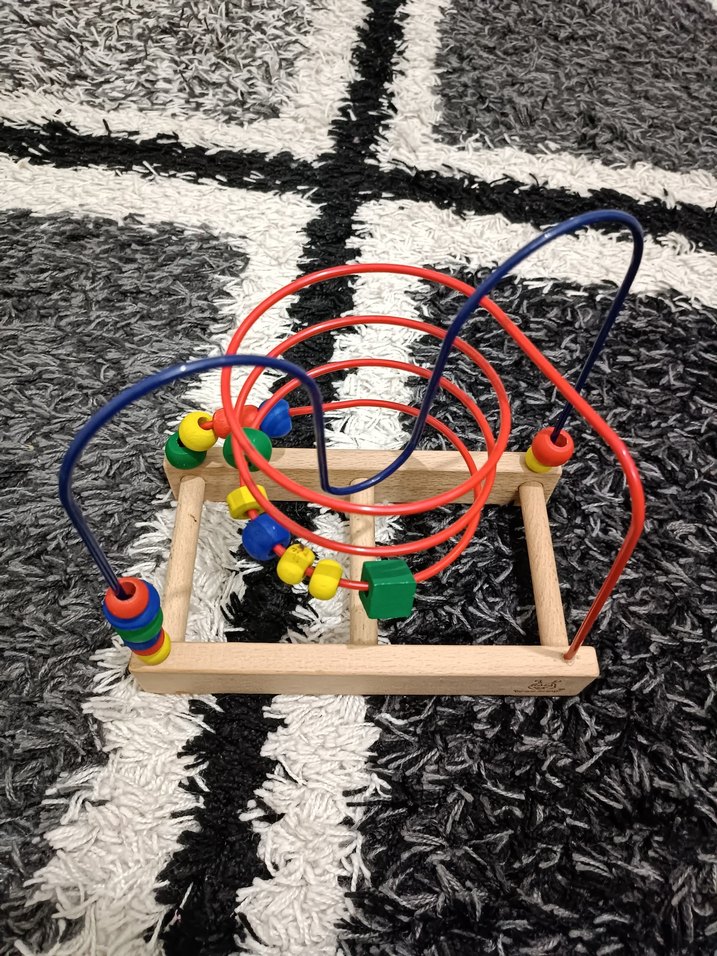 Renkli ahşap taban üzerinde kırmızı ve mavi tel yollar ve çeşitli şekilli boncuklar bulunan eğitici oyuncak.