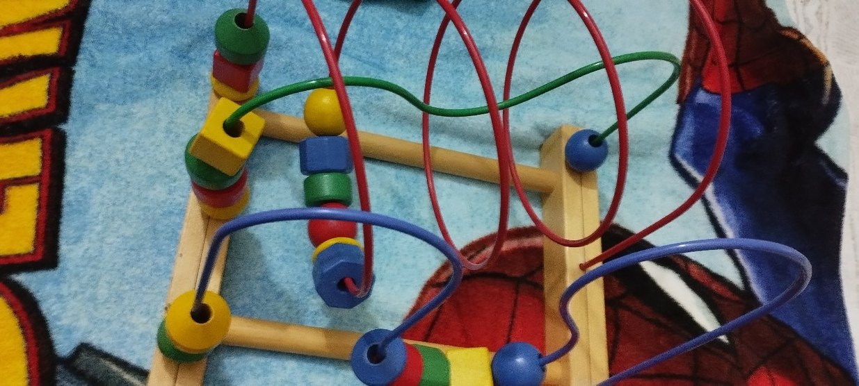 Ahşap boncuklar ve kıvrımlı metal tellerle renkli eğitici oyuncak, motor becerileri ve el-göz koordinasyonunu geliştirir.
