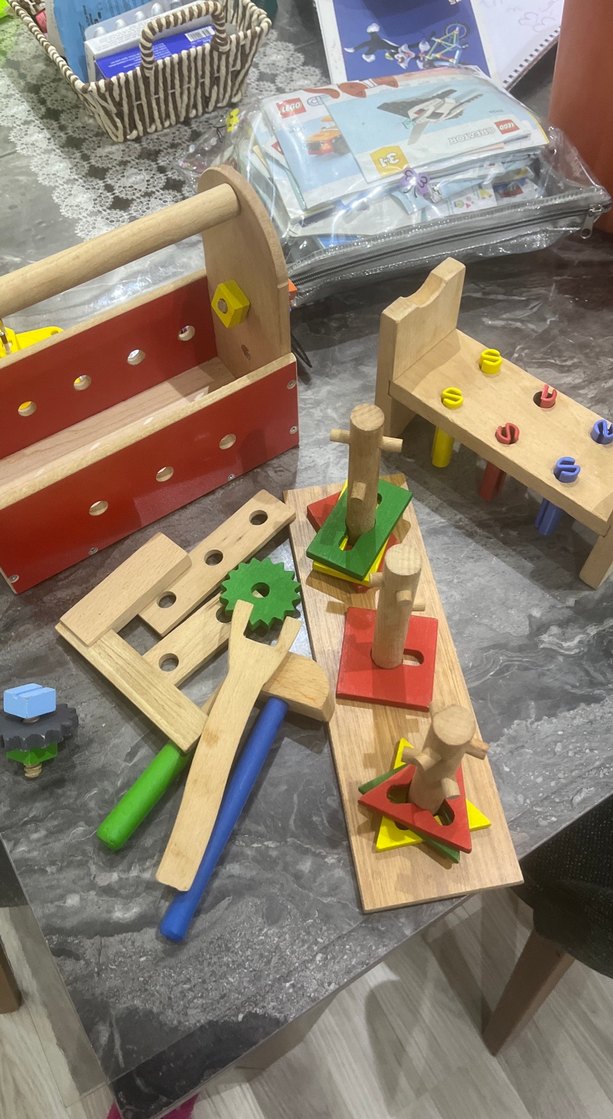 Renkli ahşap eğitici oyuncak seti, aletler, dişli parçalar ve şekil sıralama içerir, etkileşimli oyun ve beceri gelişimi sağlar.