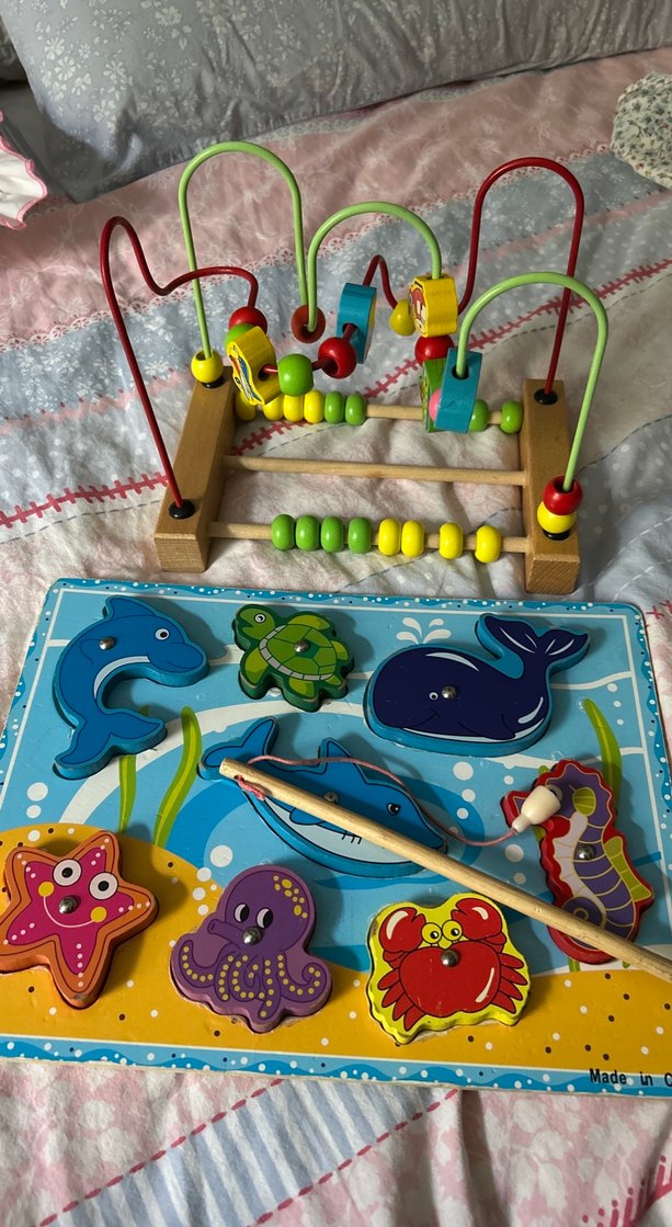 Bu renkli eğitici oyuncak seti, boncuk labirenti ve deniz hayvanları temalı ahşap balık tutma bulmacasından oluşur. İnce motor becerilerini ve el-göz koordinasyonunu geliştirir.