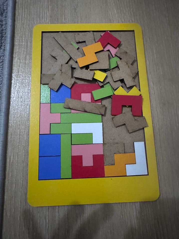 Bu renkli ahşap yapboz oyunu, farklı şekillerin çerçeveye yerleştirilmesiyle problem çözme ve yaratıcılığı destekler.